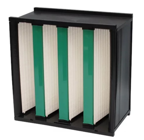 These V-shaped header frame filters are often used as a second filter stage in the supply air, either as a last filter stage for industrial, commercial and residential applications or as a second prefilter stage for cleanroom applications.